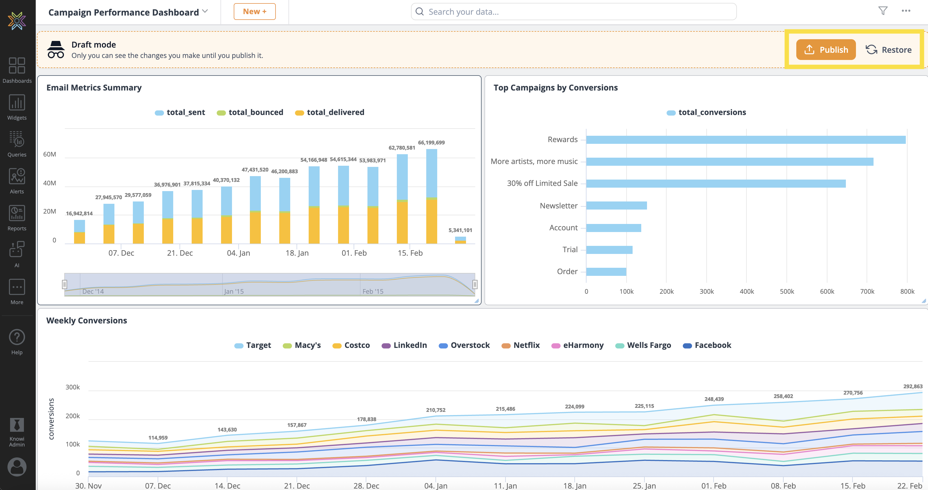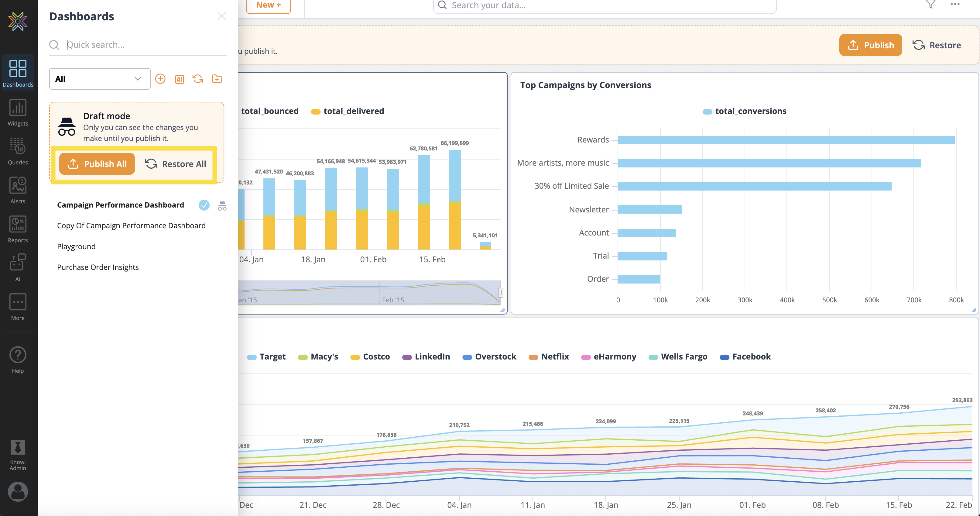 Dashboards and Widgets with changes are marked with an incognito symbol, and the Publish All/Restore All button can publish or restore these changes.