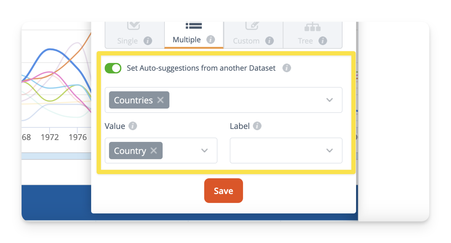 Step 4: Select the auto-suggested values or labels or both (from the dropdown list) you want to fetch from another dataset through filter picklist and click on the Save.