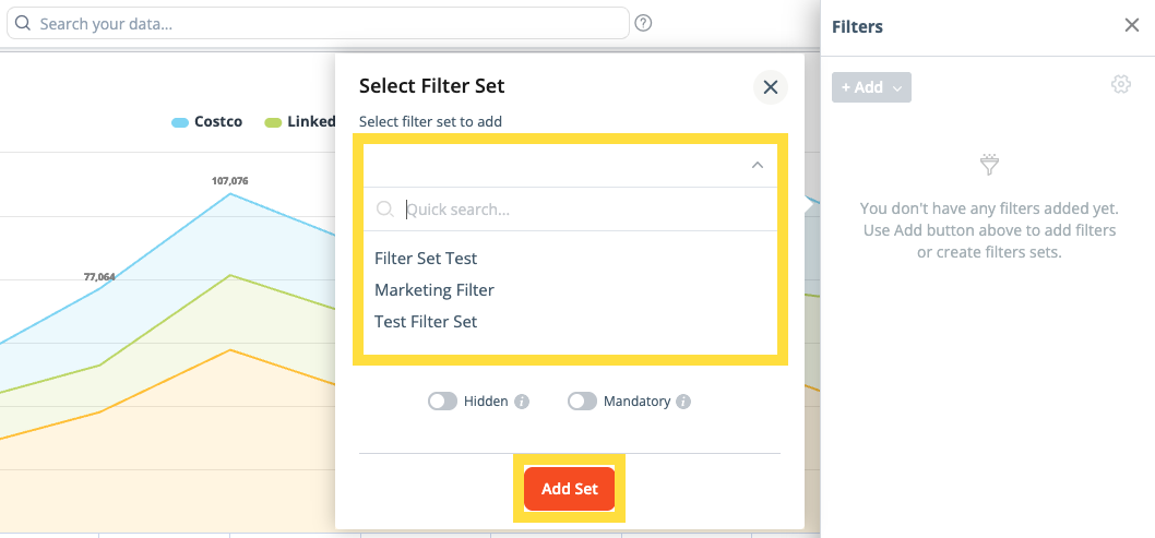 Filter Sets can be added to any dashboards for tailored results on the dashboard's data. Add the Filter Set by following the steps discussed below: