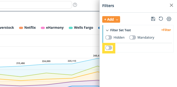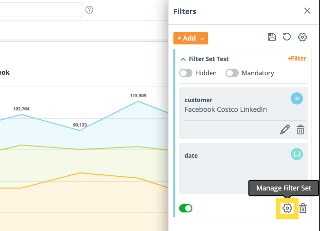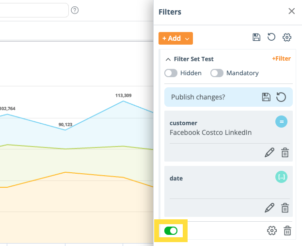 To disable a Filter Set, toggle off the green switch from the bottom left and the filter set will no longer apply to the dashboard.