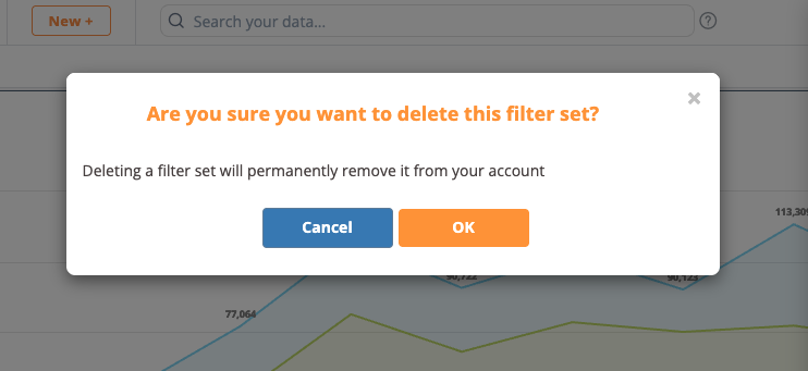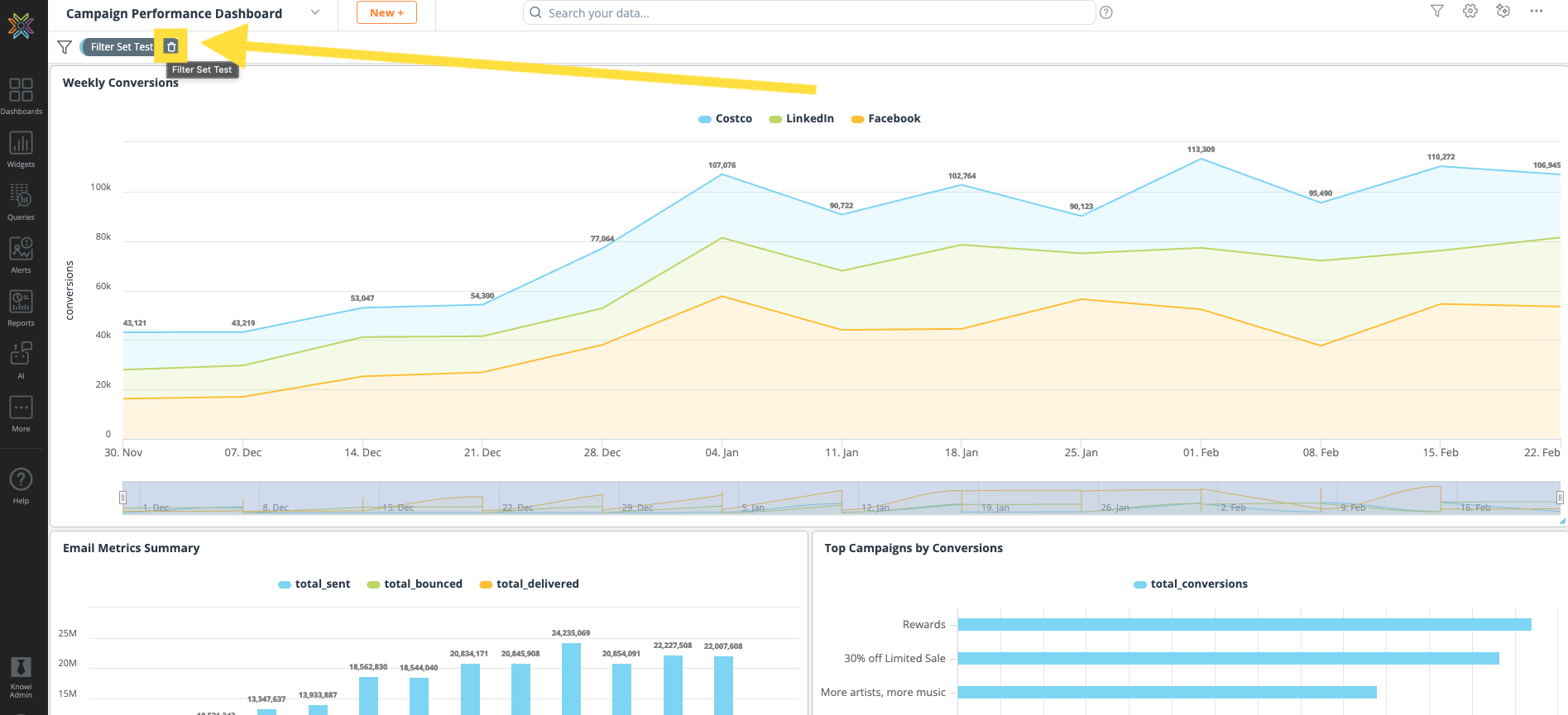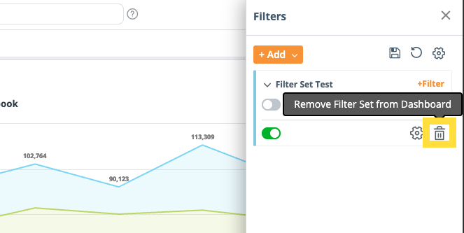 Alternatively, you can remove a Filter Set from the dashboard by clicking the trash can icon next to the Filter Set name on the top left of the dashboard. This will not permanently delete the Filter Set from your account.