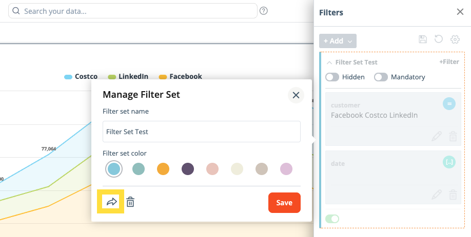 You can edit an existing Filter Set from the right sidebar to by clicking on the gear icon at the bottom-right corner of the tile. From here, you can change the filter set name and color, share the filter set, and permanently delete the filter set.