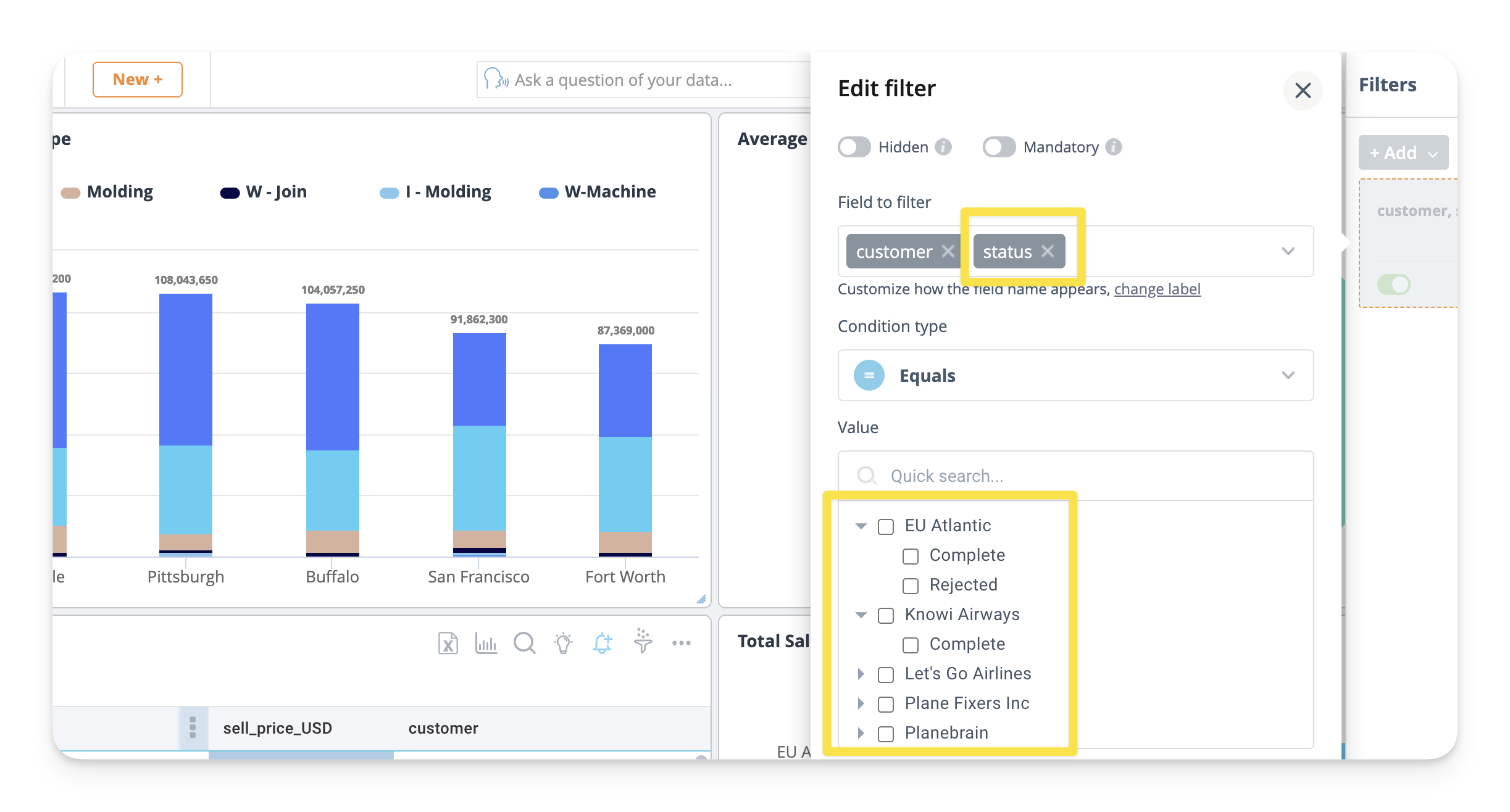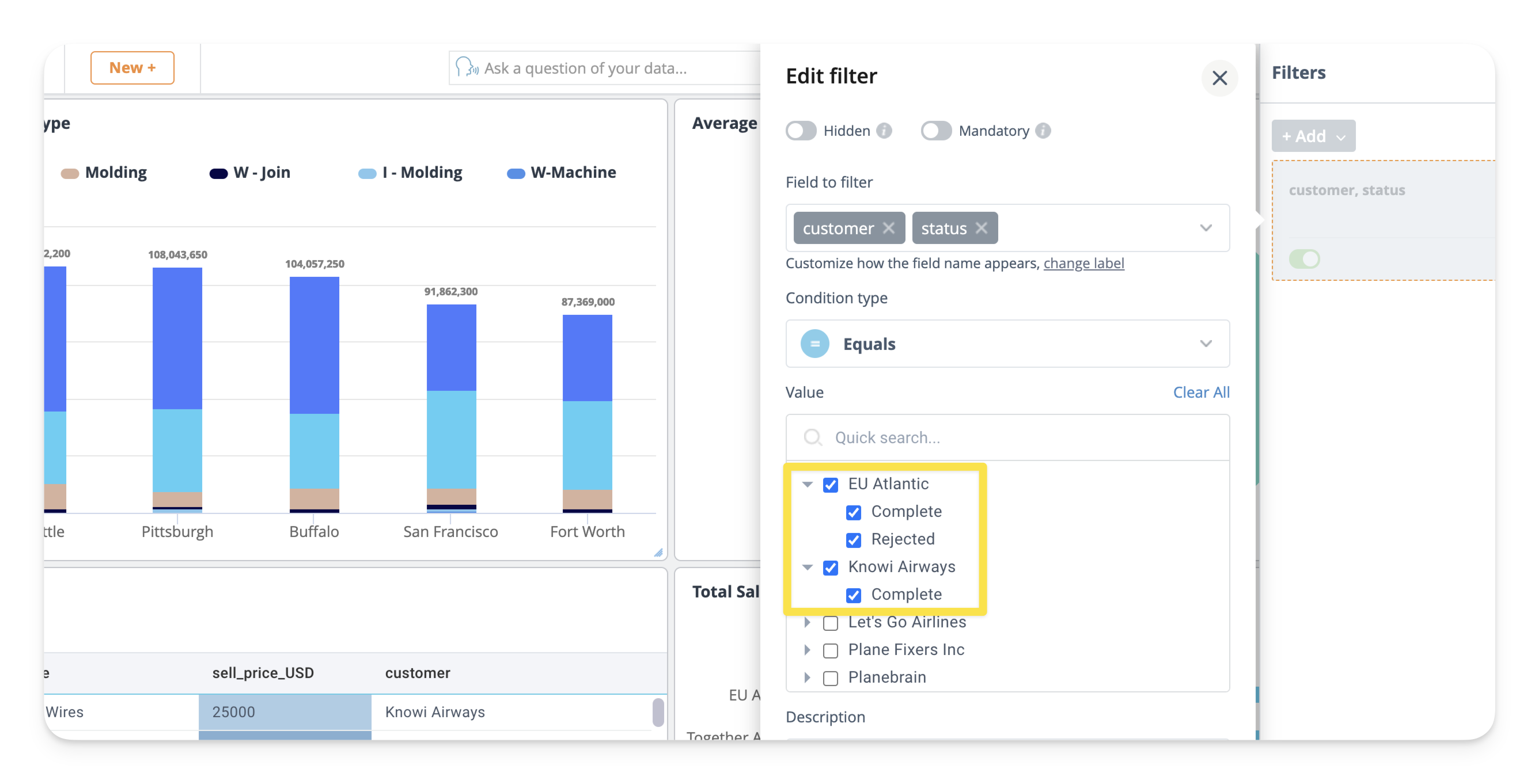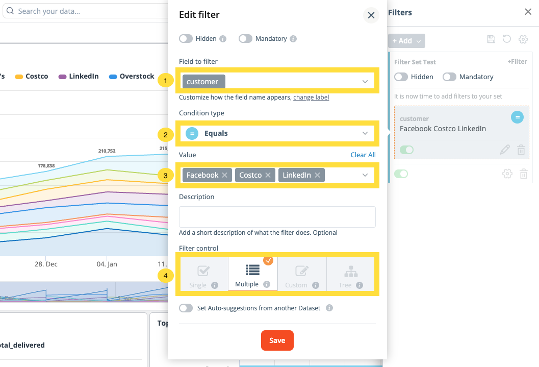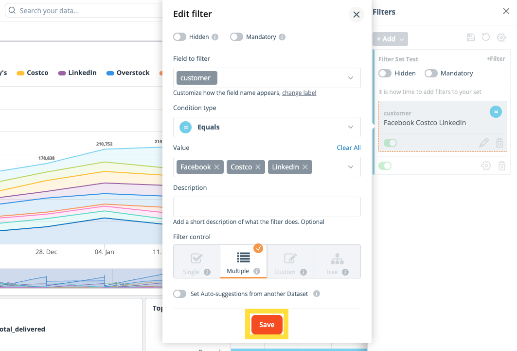 As an admin or dashboard creator, you can edit the existing filter(s) from the right sidebar to control the access of data and values the end-users can filter.