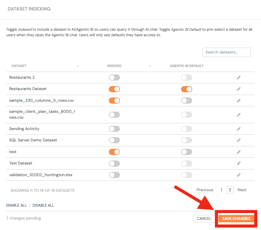 Agentic BI Default - Pre-select the dataset for all users when they open the Agentic BI chat. Defaults apply customer-wide, but users only see defaults they have access to. Disabling indexing on a dataset automatically clears its default flag.