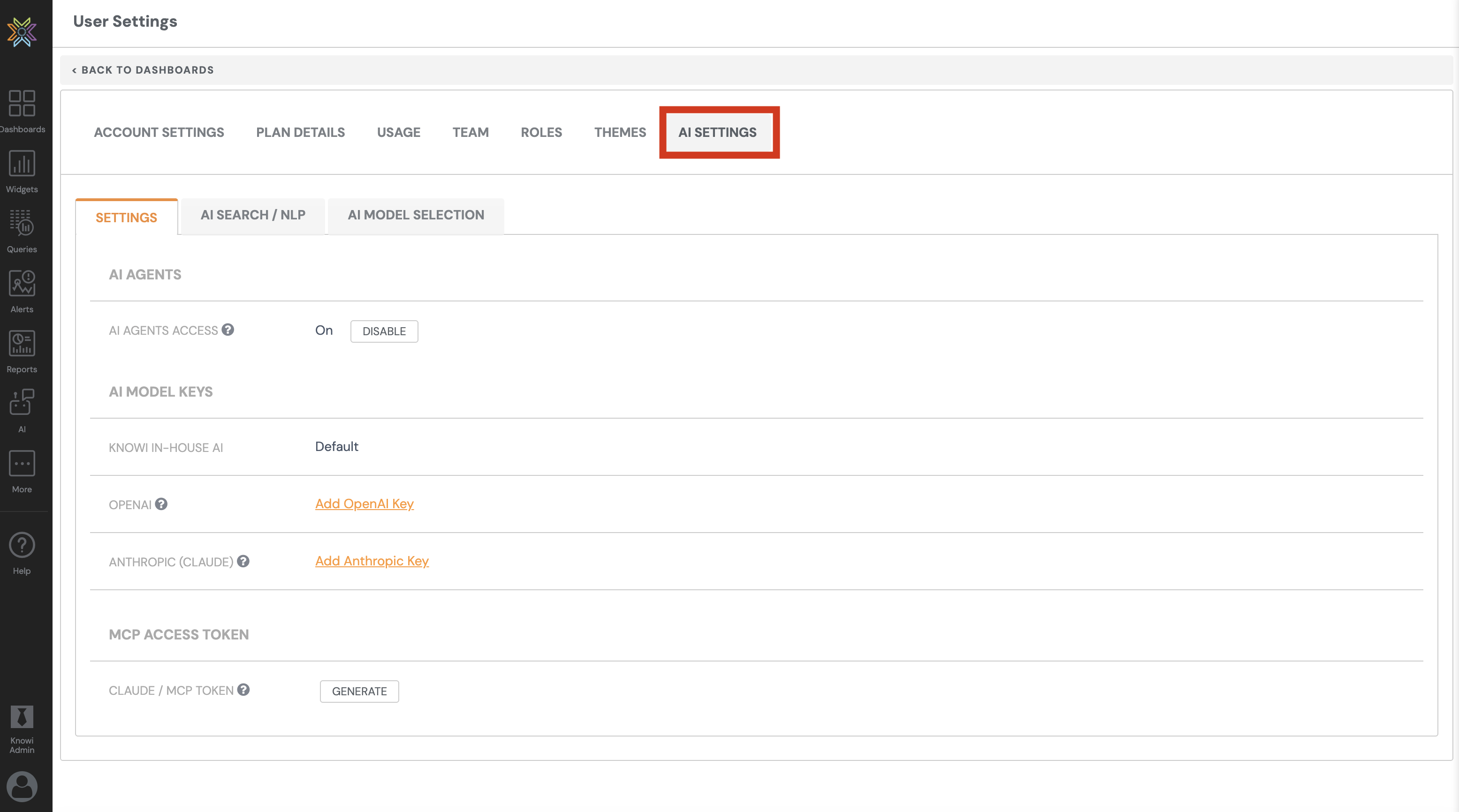 Controls AI agent access, API keys for external AI providers, and MCP token generation.