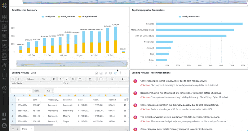 The Spreadsheet Widget is a visualization type that lets the user customize and visualize data in an Excel-like spreadsheet. It enables most Excel features, including functions, styling, sorting, and filtering. The Spreadsheet widget allows users to add sheets to work on the dataset. It can also generate shareable reports and clone the spreadsheet for further computations.