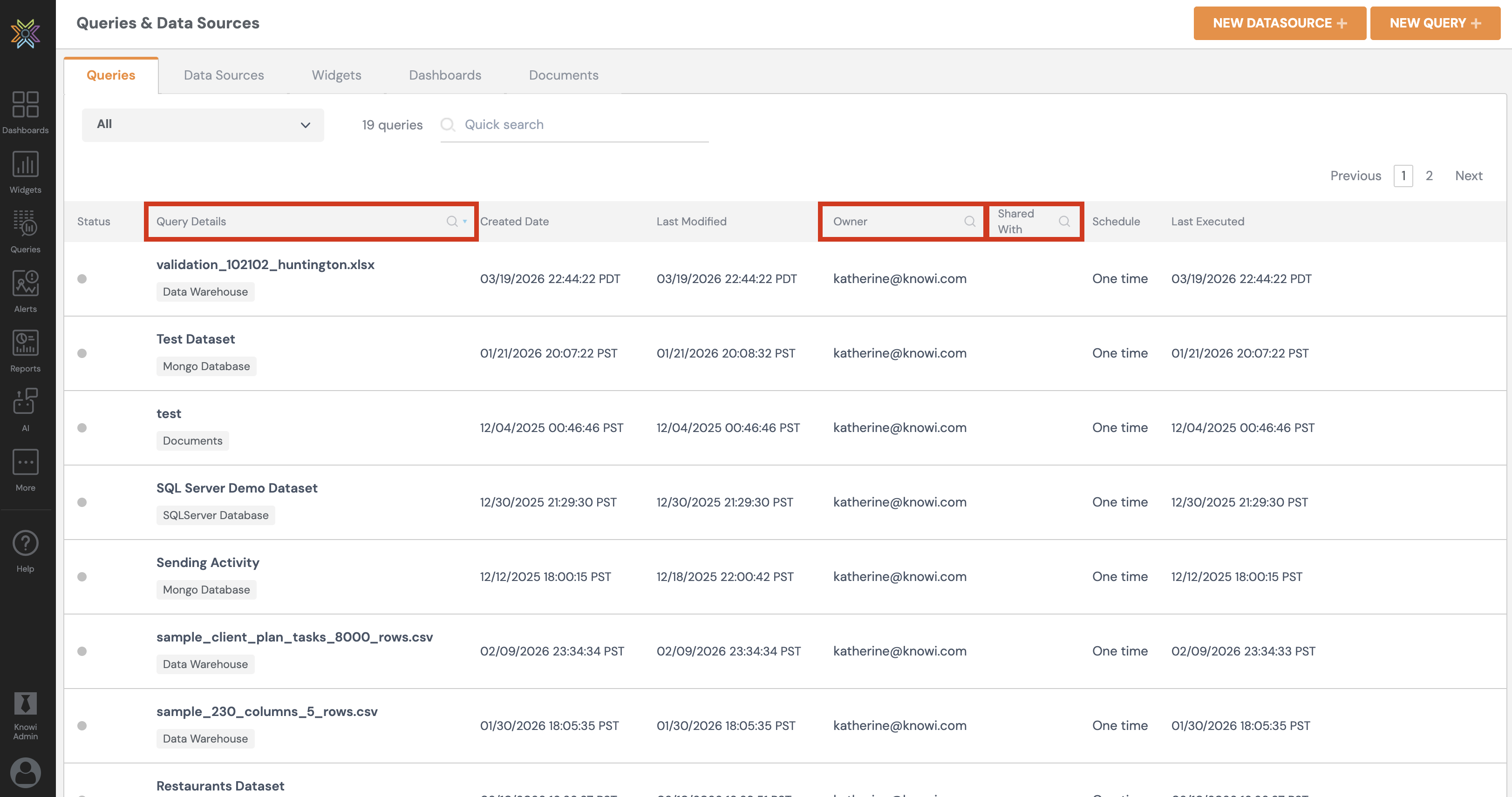 You can also search within specific fields - Query Details, Owner, and Shared With - by clicking the magnifying glass icon to the right of the field name.