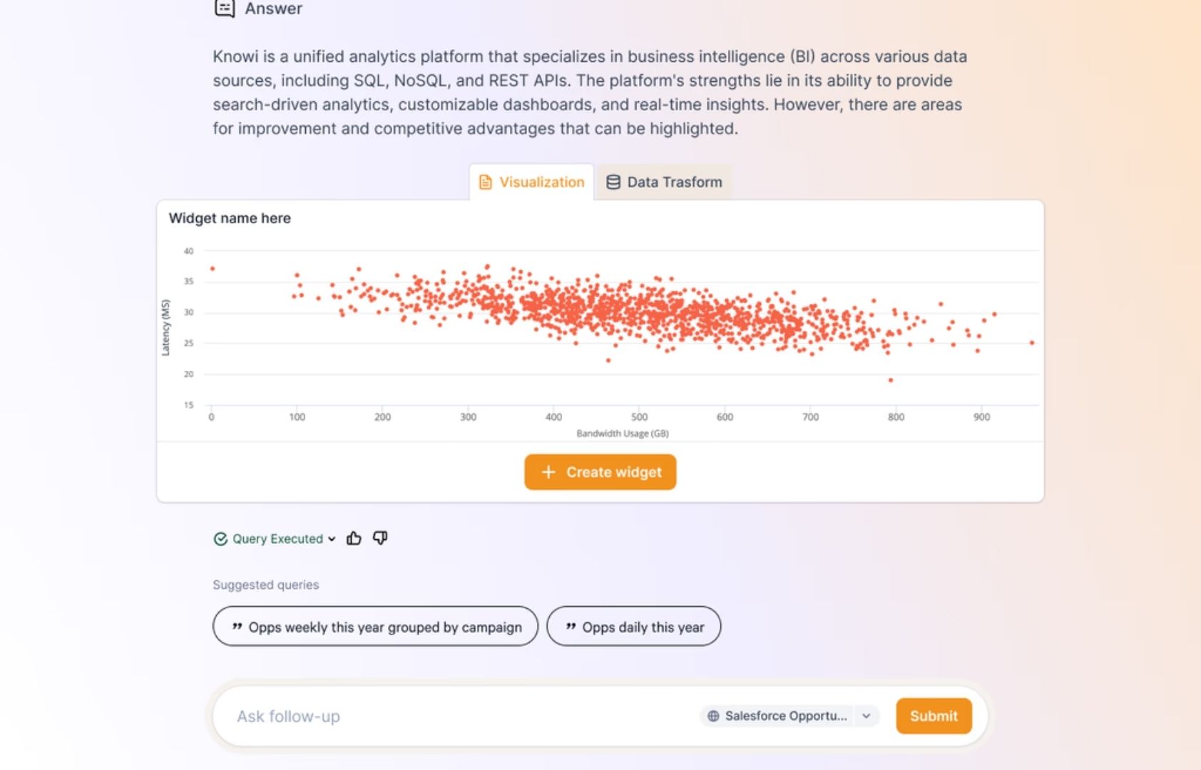 Agentic AI powers intelligent assistants inside Knowi that don’t just answer questions, they take action. Using natural language, users can ask questions, update visualizations, generate recommendations, and export results, all within governed workflows.